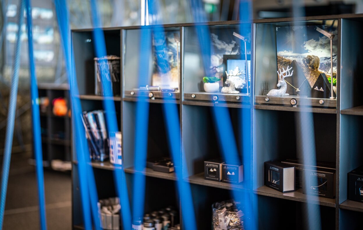 Shopping in paradise: just next to the restaurant you can purchase souvenirs for your loved ones at home, such as a bottle of wine from the Alps, stored at high altitude, or perhaps a little memento from the Zermatt Bergbahnen collection.